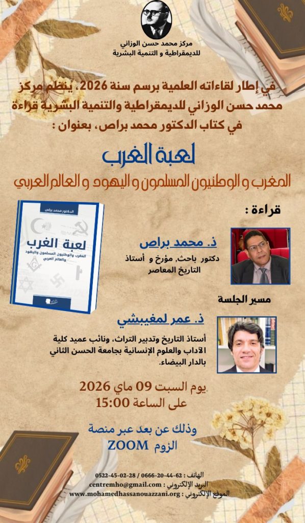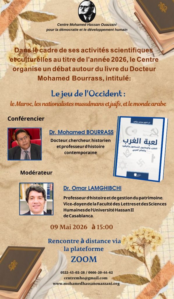 Dans le cadre de ses activités scientifiques et culturelles au titre de l’année 2026, le Centre Mohamed Hassan Ouazzani pour la Démocratie et le Développement Humain organisera une visioconférence autour du livre du DR MOHAMED BOURRASS intitulé :